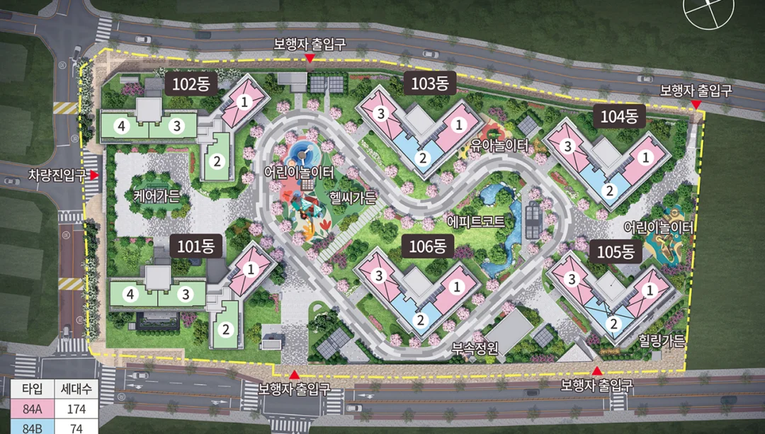 커뮤니티 시설은 GX룸, 피트니스센터, 실내 골프연습장 등이 특히 강점을 가지며, 101·102동에 집중 배치되어 있습니다.